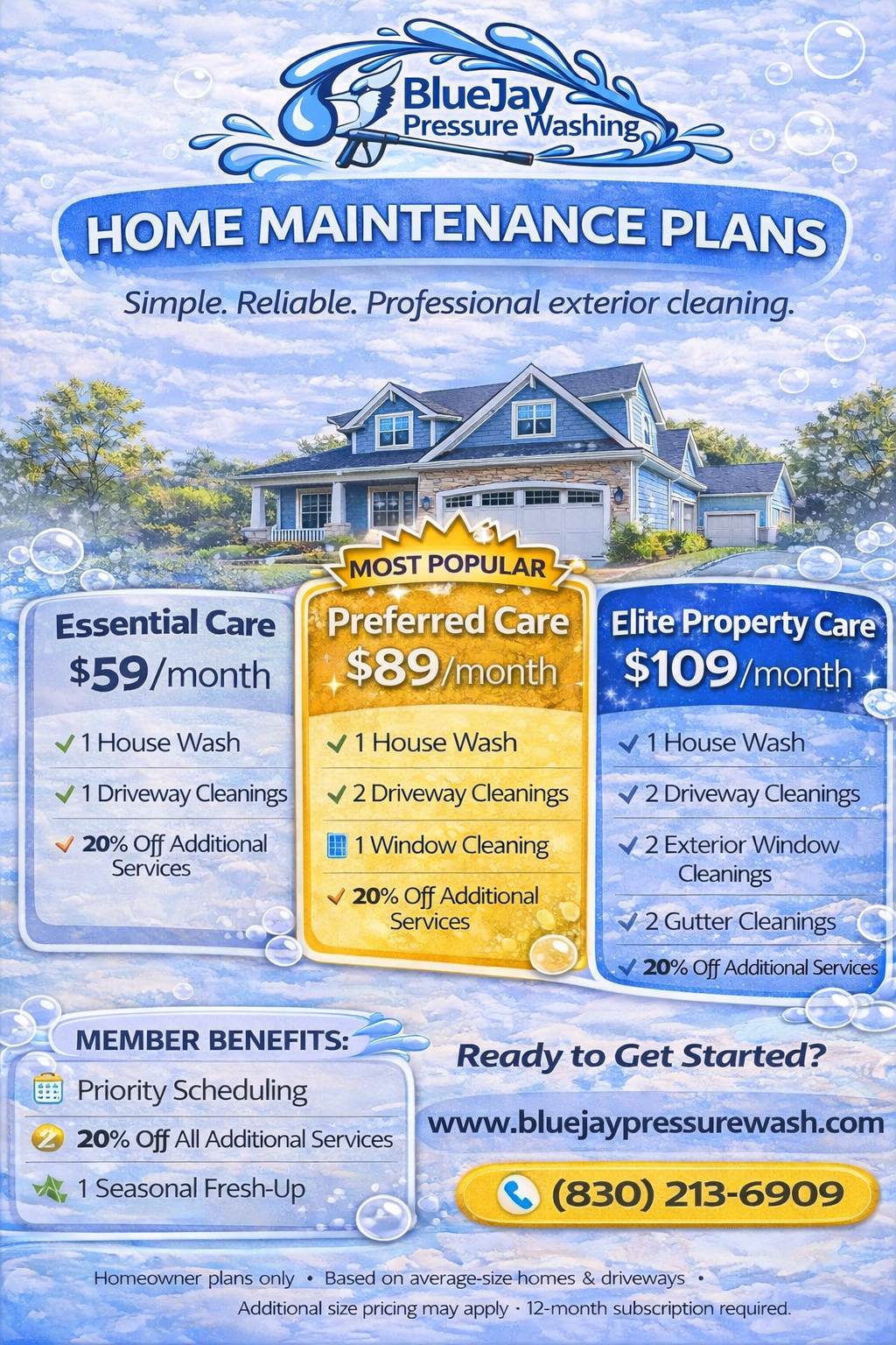 Our maintenance plans are ideal for homeowners looking for reliable pressure washing and exterior cleaning services without the hassle of one-time scheduling.